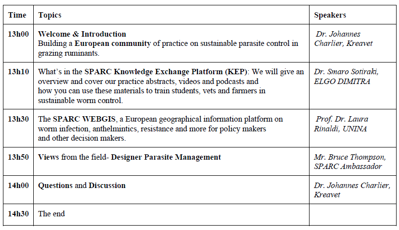 Op 26 februari 2026 van 13.00 – 14.30 uur organiseert SPARC (Sustainable Parasite Control in Grazing Ruminants) zijn tweede online EU-webinar, met als thema: Kennis uitwisselen over duurzame wormbestrijding via het SPARC KEP en WebGIS. Tijdens deze sessie komen de volgende onderwerpen aan bod: