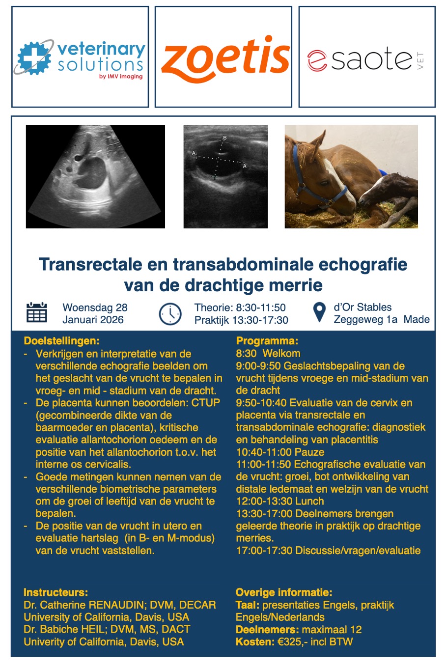 Wet lab Echografie van de drachtige merrie. In de ochtend zullen er lezingen gegeven worden en in de middag kan de theorie in de praktijk worden toegepast.