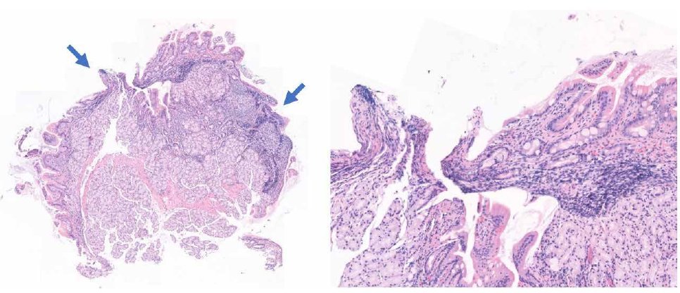 Figuur 1. Duodenumbiopt, HE-kleuring. Overzicht van het biopt met knijpartefacten (pijlen), bij hogere vergroting is verlies van cellulair detail en architectuur zichtbaar.