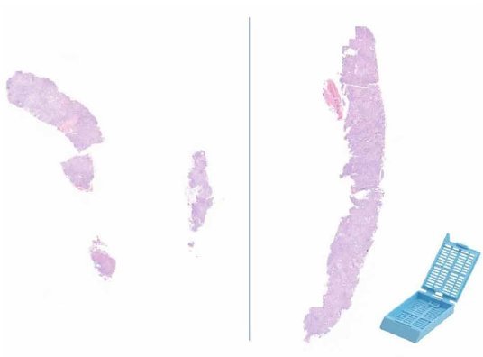 Figuur 2. ‘Tru-cut’-leverbiopten, 20x vergroting, HE-kleuring. Links een gefragmenteerd tru-cut biopt met verlies van weefsel, rechts een intact tru-cut biopt aangeleverd in een weefselcassette.