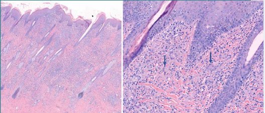 Figuur 5. Huidbiopt met een uitgebreid ontstekingsinfiltraat in de dermis, bij een hogere vergroting (rechts) zijn veel meerkernige reuscellen van het Langhans-type zichtbaar.