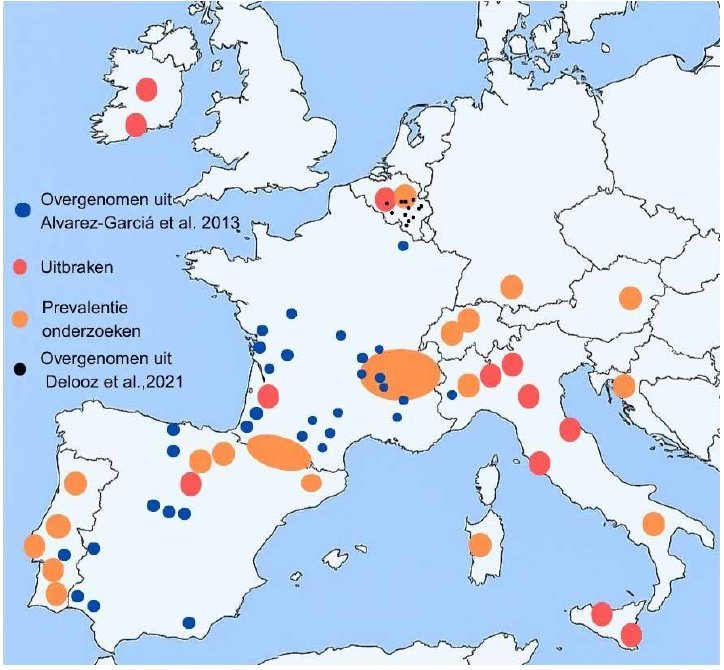 Figuur 1. Overzicht Besnoitia besnoiti in Europa. Uitbraken (rood), prevalentie studies (oranje), overgenomen casussen uit Alvarez-Garciá et al., 2013 (blauw), overgenomen casussen uit Delooz et al., 2021 (zwart).