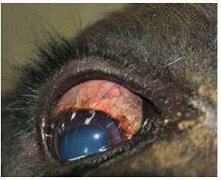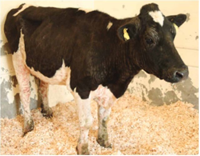 Als gevolg van vasculitis, trombose en zelfs necrose van bloedvaten neemt de vaatwandpermeabiliteit af. Hierdoor ontstaat in eerste instantie oedeem rond de kop en nek, later in ventrale delen en rond gewrichten. Gewrichten worden pijnlijk en het dier kan kreupel worden. In ernstige gevallen kan er longoedeem ontstaan. Een of twee weken na de start van de acute fase neemt oedeem af (33). Het chronische stadium van de infectie wordt gekenmerkt door de vorming van cysten in de sclera, conjunctiva en vulva (zie afbeelding 2). Intern worden op diverse plekken ook cysten gevormd zoals in de bovenste luchtwegen en het distale deel van de vrouwelijke genitaal-tractus. Zelfs in het hart kunnen cysten worden aangetroffen (28). Tevens kunnen deze ontstaan in de spenen en de uier met als gevolg een verminderde elasticiteit en wondvorming (28, 33). B. besnoiti heeft een tropisme voor bindweefsel (24). De cysten, ongeveer 0,5 millimeter groot, bevatten parasieten in een slapende toestand (34). Deze ontstaan meestal zes tot zeven weken post-infectie (33). De mortaliteitsgraad is tijdens het chronische stadium doorgaans beneden de 10 procent (33). Huidveranderingen, zoals alopecia, hyperkeratose en seborroe kunnen optreden (zie afbeelding 3). Bij ernstige verstoring van de lokale circulatie kan de huid zelfs loslaten. Ook kunnen noduli verschijnen rond de oren, poten en rug. In dit stadium valt vaak ook een lage Body Condition Score op (33, 35, 36). Daarnaast kan door cysten tussen de lamellen in de klauw chronische laminitis ontstaan (36, 37). Hoewel runderen waarschijnlijk levenslang drager blijven, kunnen ze na verloop van tijd serologisch negatief testen en klinische verbetering vertonen. Serologisch komen fluctuaties voor, waardoor dieren een negatieve testuitslag kunnen hebben om later opnieuw positief te testen (38). In een Duitse studie bleek 9,4 procent van de dieren na vier jaar seronegatief en vrij van zichtbare cysten. Twee uitzonderlijke gevallen bereikten dit stadium al na 2,5 jaar (39). B. besnoiti kan het immuunsysteem van runderen moduleren, maar er is meer onderzoek nodig om te begrijpen welke effecten de parasiet op langere termijn heeft (37, 40, 41).