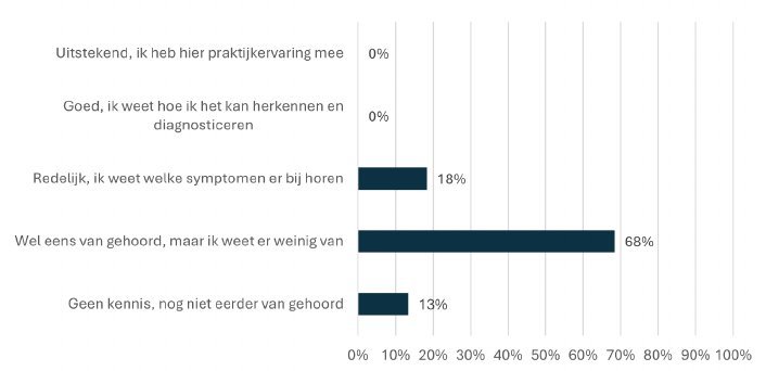 Om inzicht te krijgen in de bekendheid van besnoitiose bij rundveedierenartsen in Nederland is een vragenlijst verspreid. De respons was beperkt (n = 60) en het gaat dus niet om een representatieve steekproef. Conclusies voor gehele beroepsgroep kunnen niet worden getrokken maar de uitslagen geven wel een beeld van de huidige kennisstand. Geen van de ondervraagde dierenartsen beoordeelde zijn of haar kennisniveau als “goed”; de meesten hadden alleen gehoord over besnoitiose (zie figuur 4). In de casus van acute besnoitiose had maar 28,33 procent het opgenomen in de differentiële diagnose. In het chronische stadium werd de aandoening iets beter herkend: 40 procent plaatste het dan op de Ddx. Bij elke kennisvraag koos meer dan 20 procent voor de optie “Weet ik niet”, wat de onzekerheid onderstreept. Bovendien gaf 100 procent van de respondenten aan meer te willen weten over de aandoening.