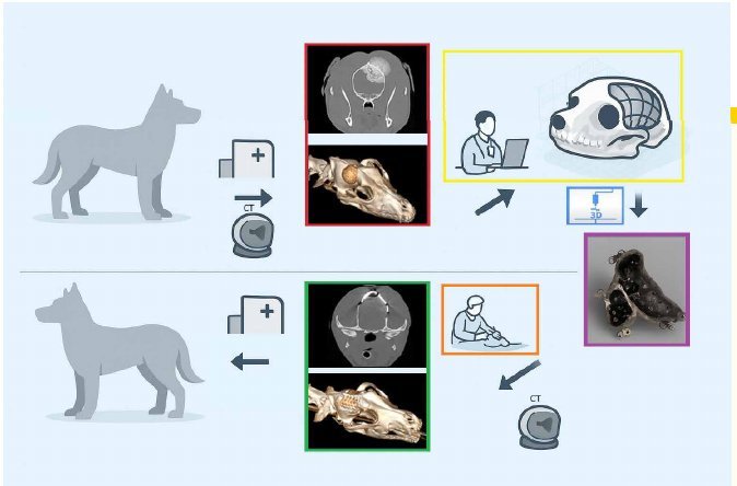 FIGUUR 2: Zorgpad voor geïndividualiseerde veterinaire zorg: van hond tot behandeling – initieel geïnspireerd door case reports. Rood: Pre-operatieve beeldvorming. Geel: ‘In silico’-design. Blauw: 3D-printing. Paars: Patiëntspecifiek implantaat. Oranje: Chirurgie. Groen: Postoperatieve beeldvorming. In dit voorbeeld is een hond met een schedeltumor opgenomen, maar dit zorgpad wordt inmiddels toegepast op diverse oncologische, orthopedische en neurochirurgische patiënten.