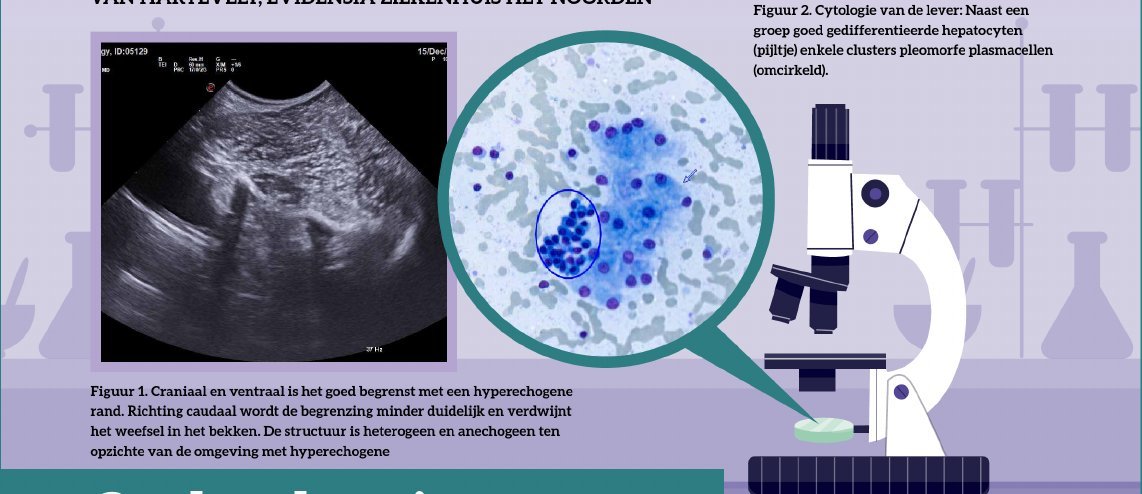 Uitstrijkjes van lever, milt en massa in het caudodorsale abdomen vertonen een vergelijkbaar beeld. Lever: uitstrijkjes met een wisselende celopbrengst bestaande uit clusters uniforme hepatocyten zonder atypie (figuur 2). Verspreid over het glaasje matige aantallen individueel en in clusters gelegen pleomorfe rondcellen. Deze rondcellen hebben vaak een excentrisch gelegen kern met grof gestippeld chromatine en een matige hoeveelheid donkerblauw cytoplasma met naast de kern een lichter gebied. Er is matige anisocytose en anisokaryose. Op de achtergrond bloed.