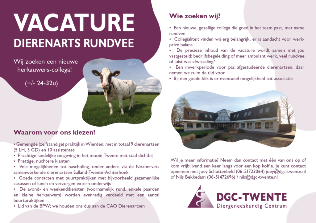 Een vacature in het mooie Twente! Wij zoeken een nieuwe rundvee collega! 😃 Zowel pas afgestudeerde als ervaren dierenartsen worden van harte uitgenodigd om te reageren. Voor de ondernemers onder ons: bij een goede klik ontstaat er binnen afzienbare tijd ruimte om te associëren.
